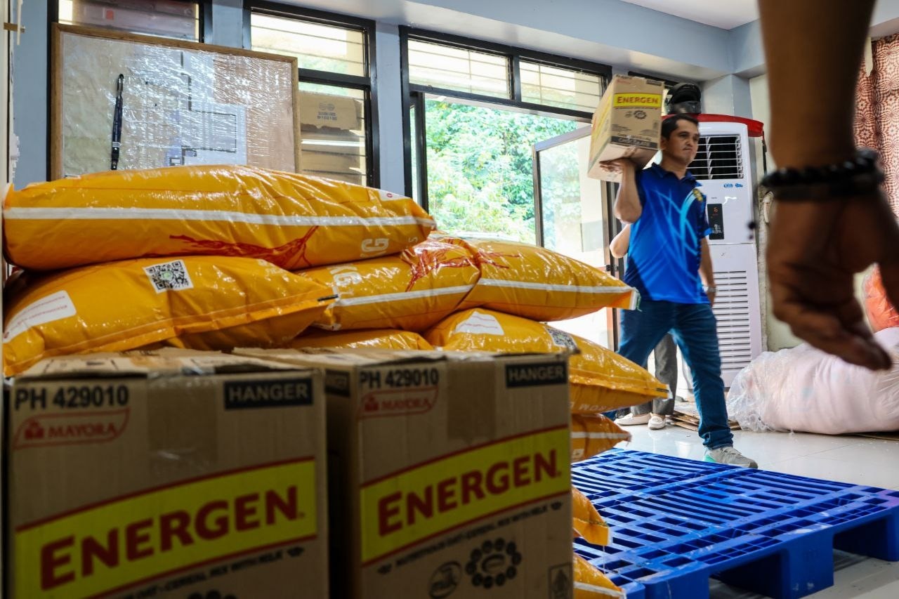 The relief items include 10 boxes of Energen, eight boxes of Fudgee Bars, 15 boxes of sardines, seven boxes of noodles, seven boxes of coffee, 70 sacks of rice each weighing 25 kilos, 100 buckets, and 200 blankets.